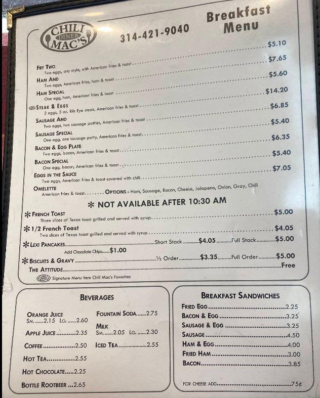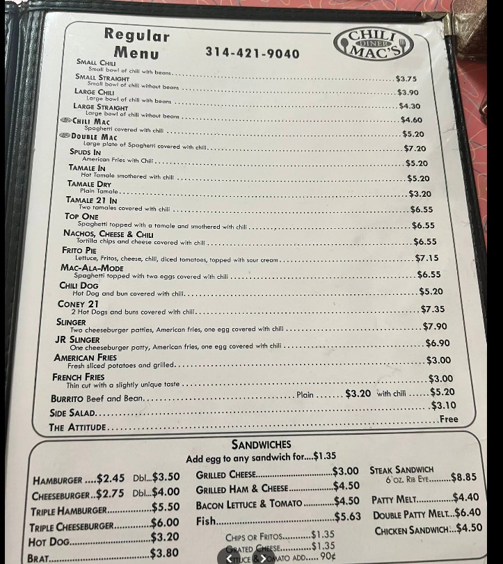 Was in St Louis for a conference and was looking for a cost friendly breakfast so Chili Mac's was it. Old school Diner that's been there since 1904. The ladies are so nice and the food is pretty good. Loved the pancakes.